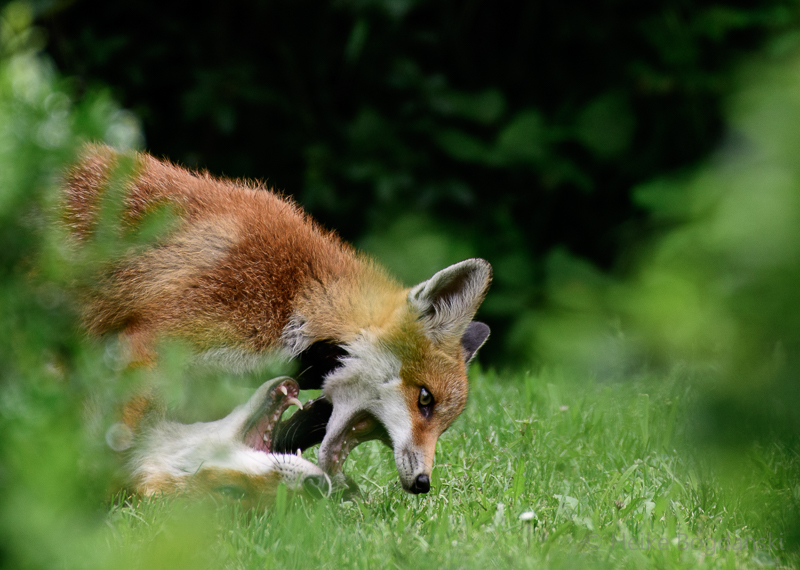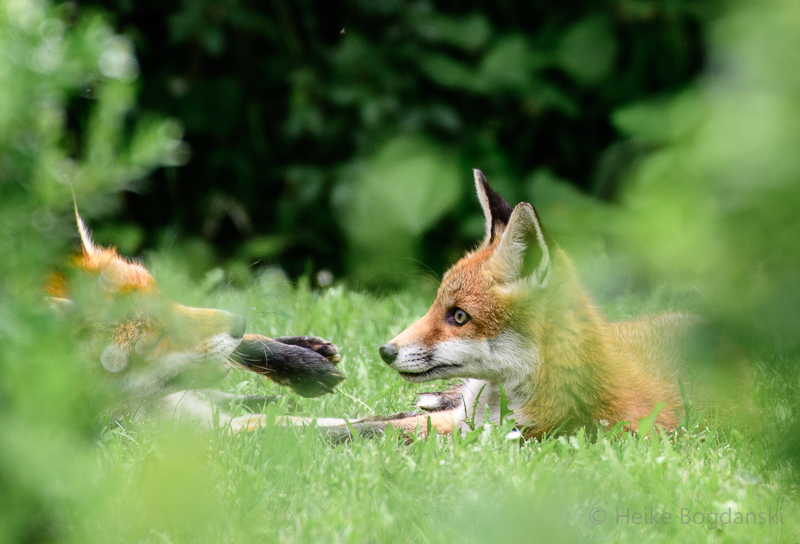 Mit etwas Geduld kann ich die scheuen Füchse in unserem Garten fotografieren. Hier hält sich gelegentlich die Fähe mit ihrem Kind auf. Und das sogar tagsüber, obwohl der Fuchs eher nachtaktiv ist. Und wenn ich bewegungslos bleiben kann, entdeckt mich die sehr aufmerksame Mutter nicht sofort.